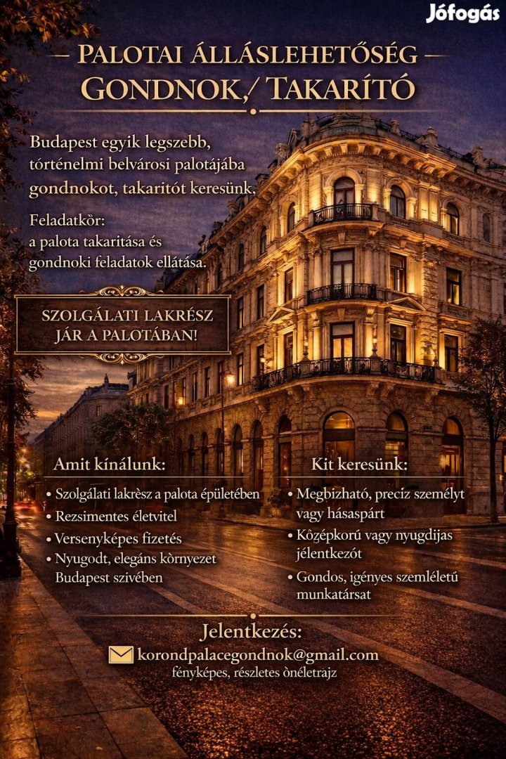 A boldog békeidők hangulatát idéző palotai környezetben kínálunk különleges munkalehetőséget annak, aki szereti a rendezett, elegáns környezetet, és örömmel vigyáz egy történelmi épület mindennapi működésére.