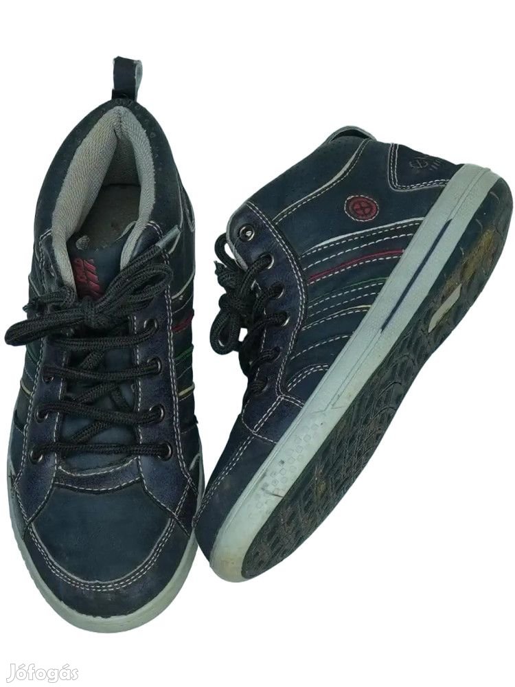 Csíkos díszítésekkel, mege szárú utcai műbőr tornacipő, belső talphossz: 22,4cm
