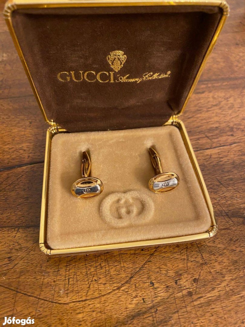 Eladó egy eredeti Gucci mandzsettagomb-pár, klasszikus arany- ezüst bicolor kivitelben. A Gucci ikonikus GGmotívuma a márka olasz luxusörökségét hozza el, elegáns, időtálló darabként. Tökéletes választás ünnepi alkalmakhoz vagy gyűjtők számára, akik szeretik a 8090es évek vintage stílusát.