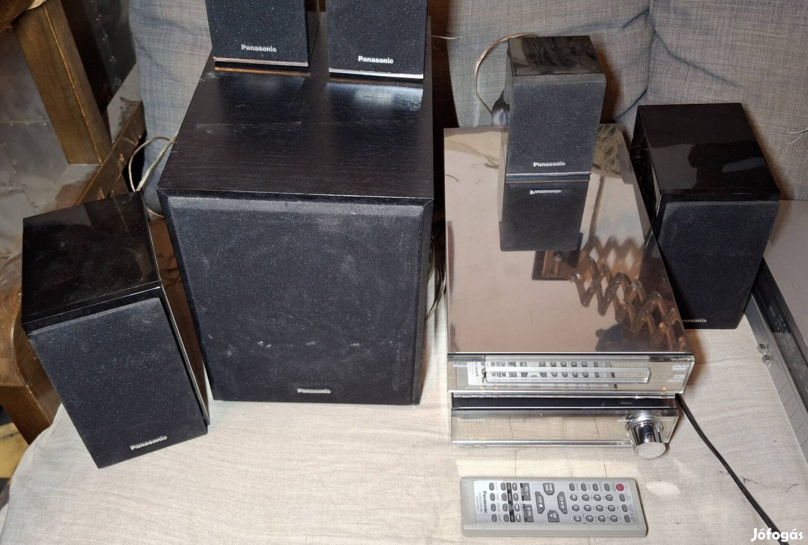 Panasonic házimozi rendszer eladó. Rádió, CD, AUX, DVD. A front hangfal pereme odavan. A távirányító nem a sajátja de majdnem mindent irányít. Minden funkciója működik.