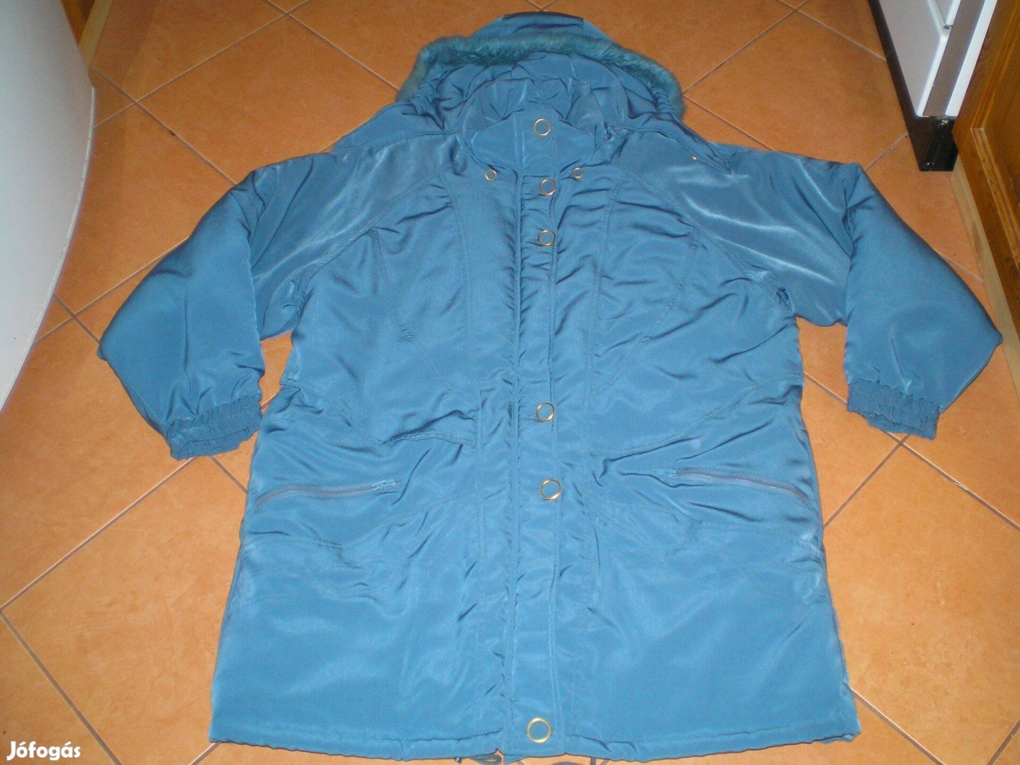 Kék szőrmés kapucnija van, mely le is cipzározható.