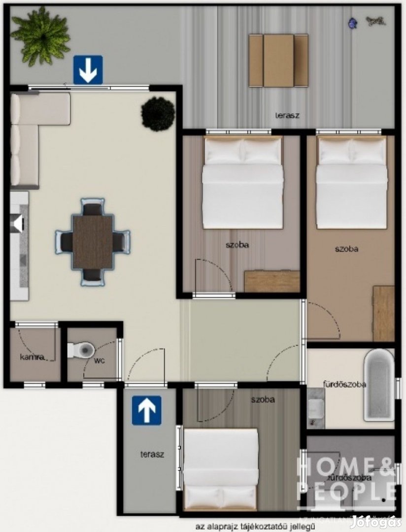 3 szoba, fürdőszoba, wc, zuhanyzó,gardrób, amerikai konyhás nappali, wc, közlekedő, 2 terasz, kamra