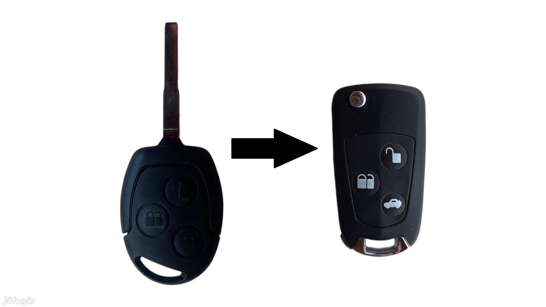 Ford C-Max, S-Max, Fiesta, Focus, Fusion, Galaxy, Ka, Mondeo, Transit Connect modellekhez elektronika nélküli módosított bicskakulcs átalakító HU101 nyerskulcs szárral. 3 gombos távirányító házzal, emblémával.